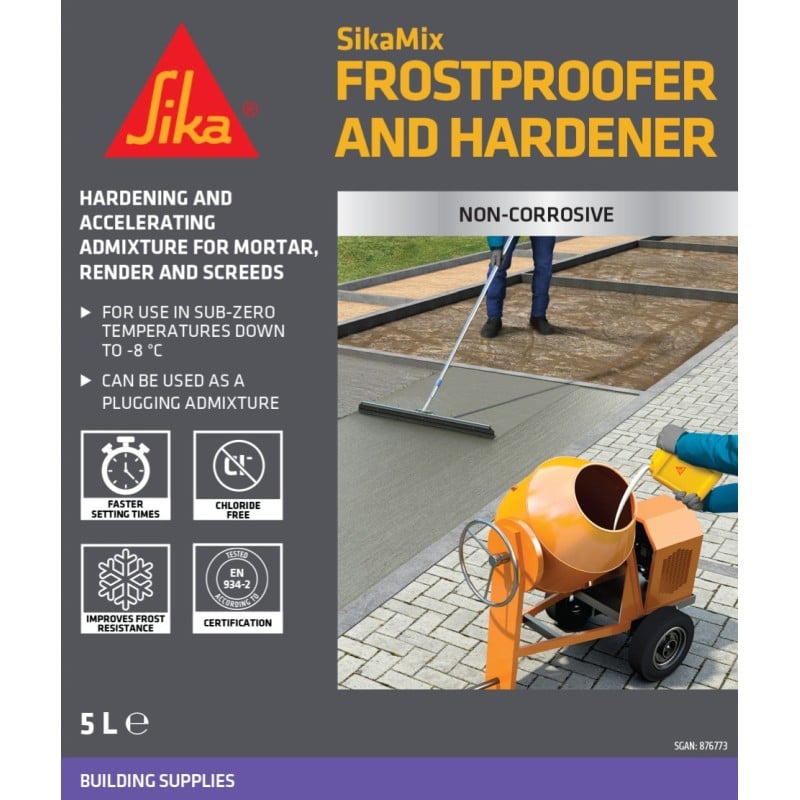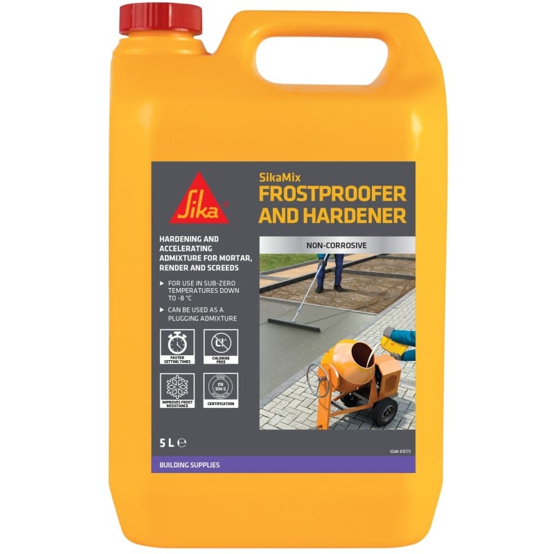 Sika SikaMix Frostproofer and Hardener 5 Litre (878091) is a dual-action liquid admixture that speeds up setting and hardening while improving protection against frost damage during cold weather work. Designed for use in mortar, render, screeds and non-structural concrete, it helps keep jobs moving when temperatures drop by reducing delays caused by slow set.