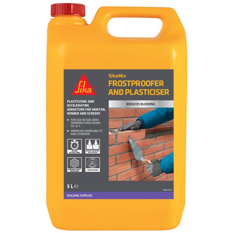 SikaMix Admix Frostproofer – High-Performance Admixture for Cold Weather Construction (5 Litre) and as a all round plasticiser The Sika Admix Frost-proofer is an advanced, high-performance liquid admixture specifically formulated to tackle the challenges of working with mortar in cold weather conditions. Designed to enhance the workability of cement-based mixes, this versatile product combines the benefits of a plasticiser and frost-proofer, ensuring efficient, reliable results even in freezing temperatures. Supplied in a practical 5-litre container, it is perfect for both small-scale and professional winter construction projects. The innovative formula reduces water demand, improves plasticity, and accelerates setting times, making it an ideal choice for bricklaying, pointing, and rendering tasks during the colder months. Additionally, it protects the mortar from frost damage during curing, ensuring a strong, durable finish that stands up to harsh environmental conditions.