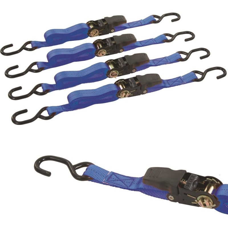 Featuring an automatic locking ratchet mechanism, these straps tension loads quickly and securely, while the quick-release high-tension handle with cushioned thumb grip makes them comfortable and easy to operate. Vinyl-coated steel S-hooks help protect anchor points and reduce the risk of damage to the items being secured. Conforming to EN 12195-2, this set is ideal for use on cars, vans, trailers, roof racks and general load restraint.