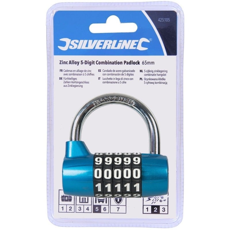 The Silverline Security 5-Digit Combination Padlock (65mm) offers reliable protection for personal and professional use. Featuring a robust zinc alloy body and a hardened steel shackle, this padlock provides excellent strength and cut resistance, making it suitable for securing lockers, toolboxes, luggage, gates, and storage units.
