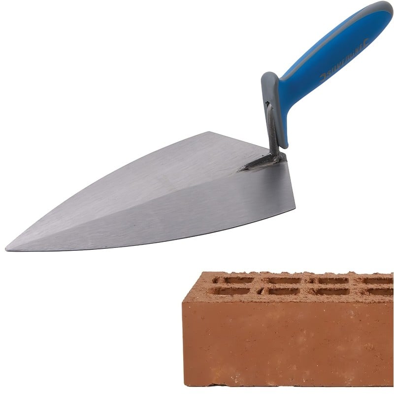 The trowel is solid forged from a single piece of hardened and tempered carbon steel, making it tough and durable for professional bricklaying and general building work.