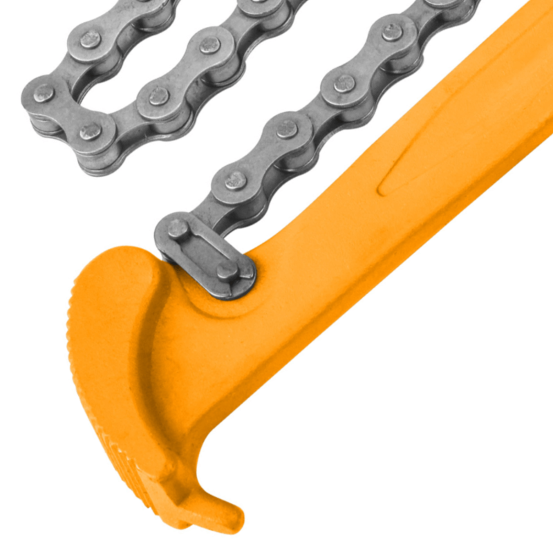 The non-slip tooth pattern on the chain bites into the workpiece as you apply turning force, so the grip tightens rather than slips. This makes it well-suited to plumbing jobs, automotive maintenance, and general workshop tasks where control matters.