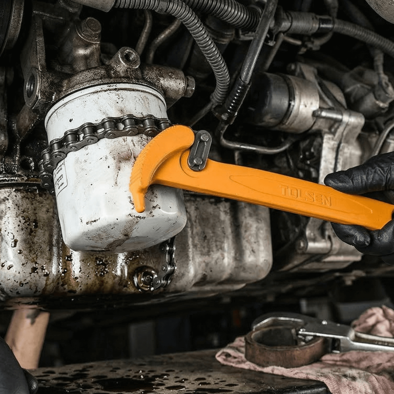 The Tolsen 225mm Industrial Chain Wrench is a well-built holding tool for gripping pipes, filters, and fittings that fixed-jaw wrenches cannot handle. Its heat-treated carbon steel handle and 500mm toothed chain deliver a strong, controlled grip across plumbing, automotive, and workshop applications.