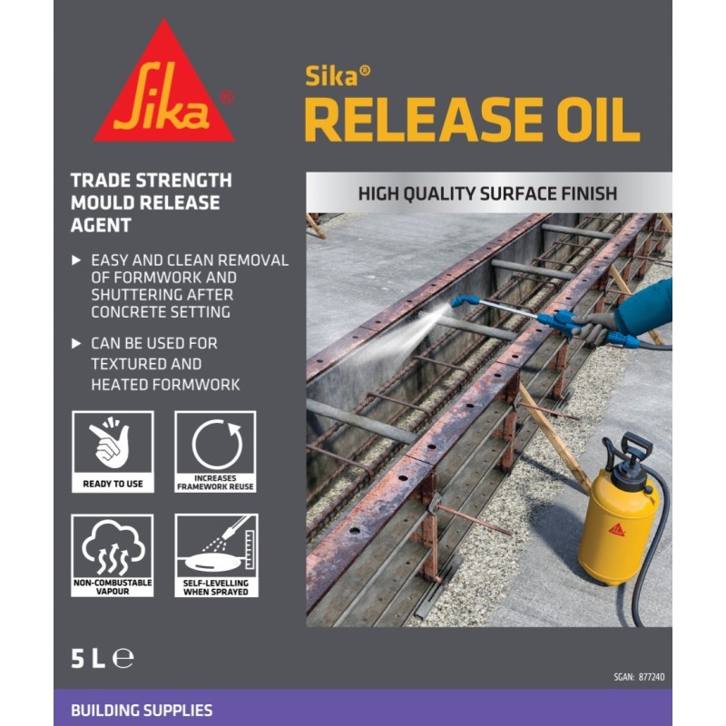 The Sika Release Oil is a high-quality product designed to ensure easy and clean removal of concrete from moulds and formwork. Supplied in a 5-litre container, this advanced release agent provides superior performance, reducing surface imperfections and extending the life of moulds and formwork.
