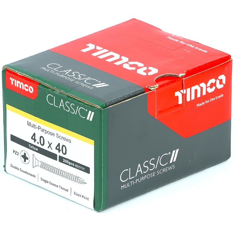 Timco Classic 40040CLAF Multi Purpose Screws 4.0 x 40mm PZ2 Double Countersunk (Box of 200) a dependable general-purpose fixing choice for a wide range of woodworking, joinery and interior fitting tasks. This 40mm size is well suited to lighter timber work, sheet materials and everyday construction jobs where a shorter screw is needed for secure fixing without excessive penetration. Supplied in a box of approximately 200, these screws combine reliable holding power with a neat countersunk finish.