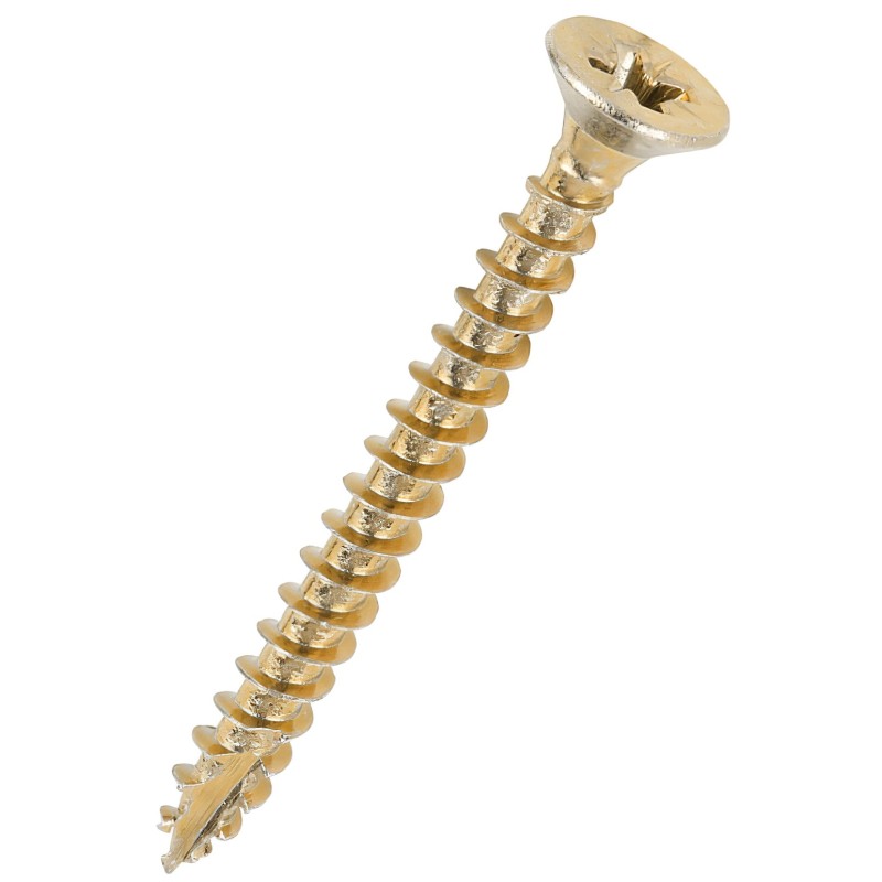 Manufactured from carbon steel with a yellow passivated finish, these screws feature a sharp 25° point for a fast start, a deep single thread for solid grip and patented lubrication to reduce driving resistance. The double countersunk head helps improve head strength and supports a cleaner finish, while the fully threaded 40mm length gives consistent engagement through the material. They are suitable for use in hardwood, softwood, chipboard, MDF, plastic and thin sheet metal.