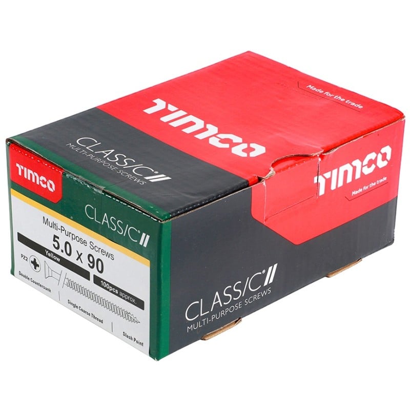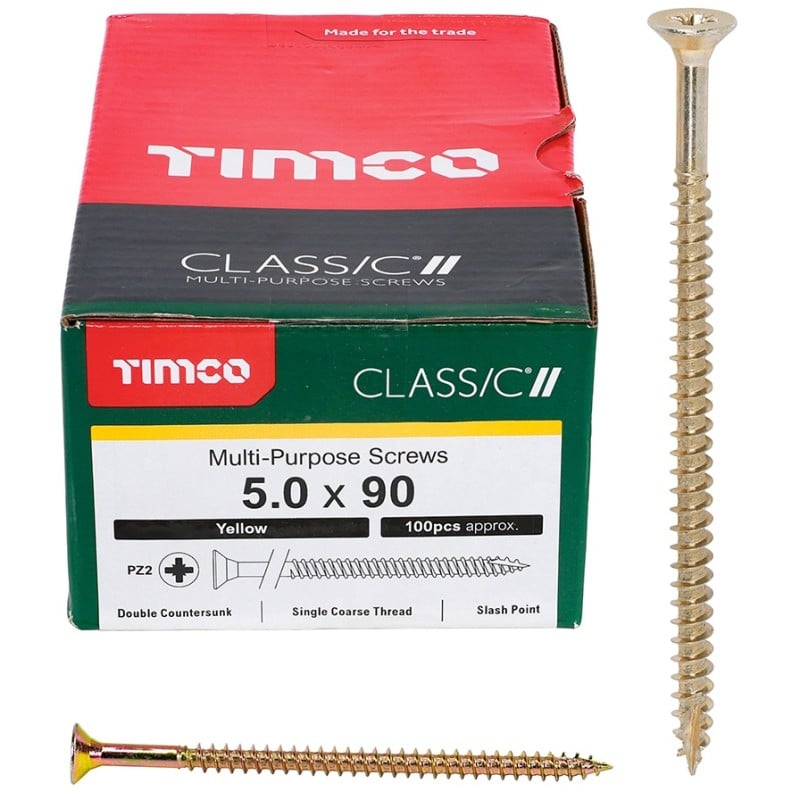 Timco Classic Multi Purpose Screws 5.0 x 90mm are high-performance PZ2 double countersunk screws designed for reliable fixing across a wide range of materials. Supplied in a box of 100, these yellow passivated screws feature a sharp 25° point, special thread design, and patented lubrication to improve insertion and reduce driving resistance. They offer strong holding power in timber and sheet materials, while the double countersunk head helps reduce head shear and supports a neat finish. This 5.0 x 90mm size is partially threaded and is suitable for use in hardwood, softwood, chipboard, MDF, plastic, and thin sheet metal.