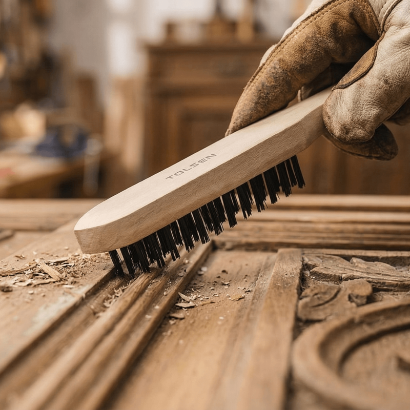 A 5-line wire brush works on both metal and wood. On metal, it removes rust, grime, and loose paint. On wood, it strips dirt and flaking paint - apply lighter pressure on softer wood to avoid marking the surface.