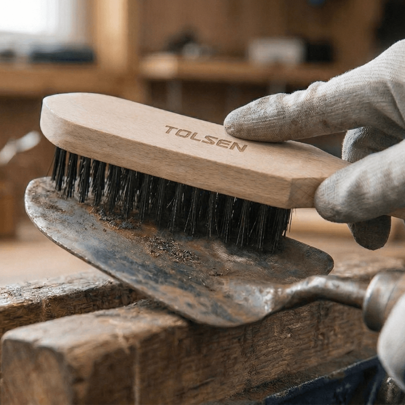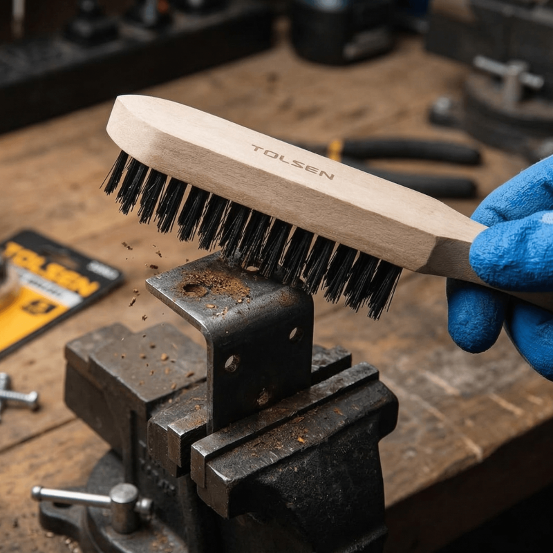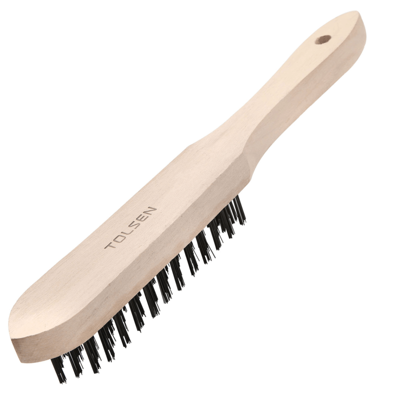 The Tolsen 5-Line Brazing Wire Brush is a straightforward hand tool for cleaning, rust removal, and surface preparation on metal and wood. Straight black wire bristles and a wooden handle combine to give you firm control in tight spots and small areas. It handles everything from scrubbing rust off a metal bracket to removing debris from a narrow groove.