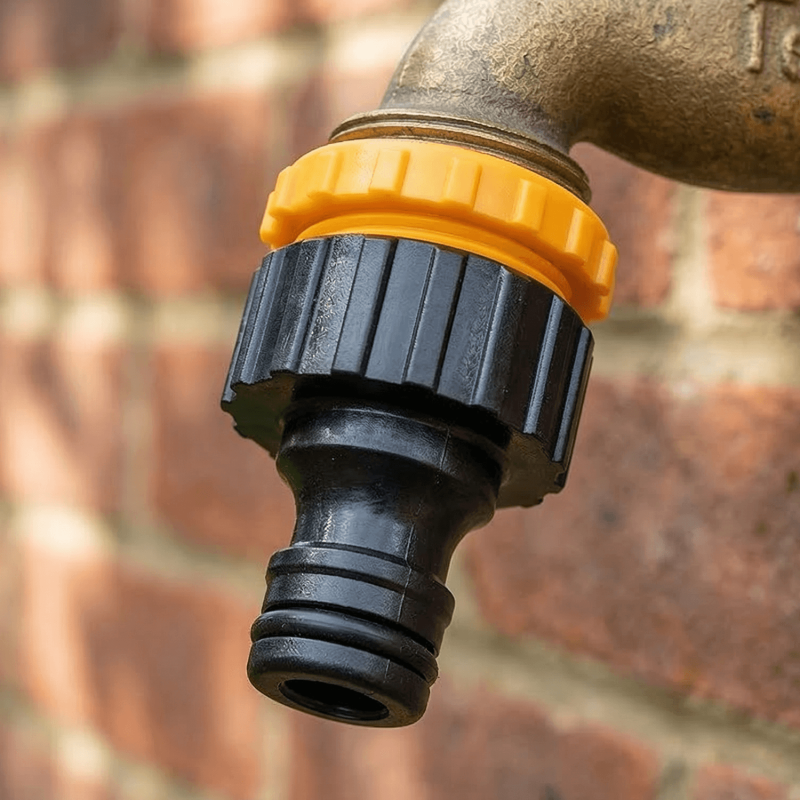 Attach the Tap Adaptor: Screw the 1/2" tap adaptor onto your outdoor tap by hand. Tighten firmly without using tools to protect the plastic threads.
