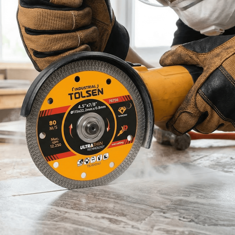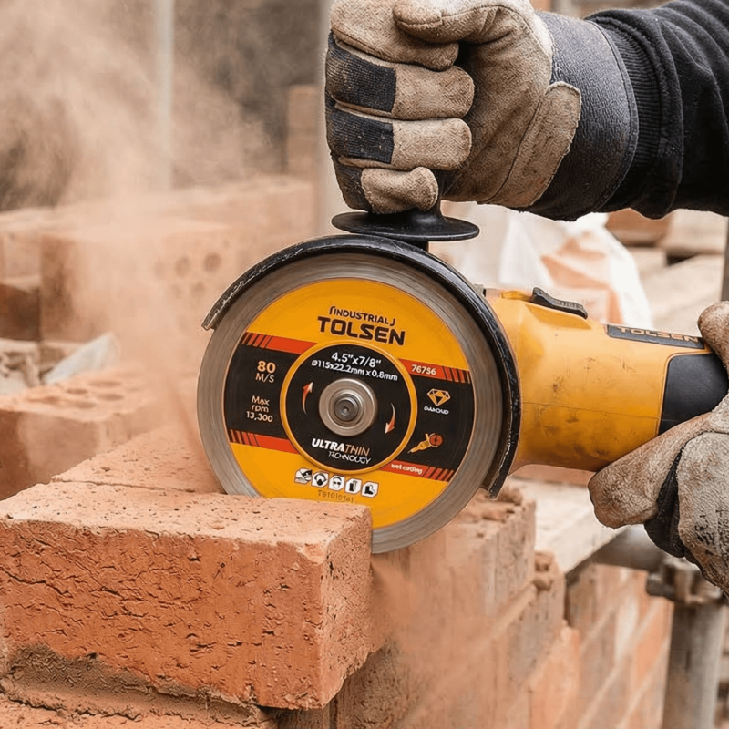 The Tolsen Industrial Ultra Thin Diamond Slitting Disc cuts brick, plaster, and tile on professional construction and renovation sites. At 115mm in diameter with a 1.2mm cutting width, it removes minimal material per pass. The 10mm segment width adds to a longer working life compared to narrower-segment alternatives.