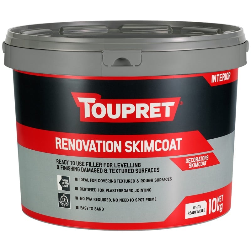 Toupret Renovation Skimcoat is a ready mixed interior filler designed for levelling, skimming, and finishing damaged or textured surfaces. It handles high-build applications up to 5mm thick, making it well suited for covering rough surfaces, old textures, stucco, and Artex.