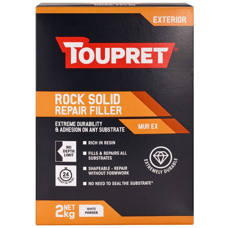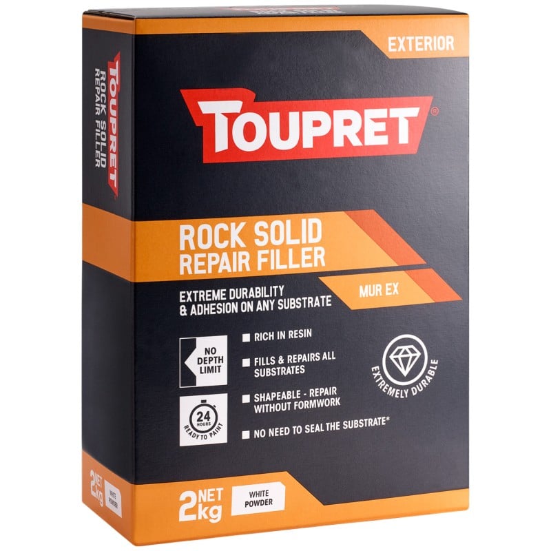 Toupret Exterior Rock Solid Repair Filler is a cement-based exterior repair filler that sets to an exceptionally hard finish. It bonds to virtually any substrate with no limit on application depth. Rich in resin, it shapes without formwork and requires no substrate sealing prior to use.