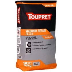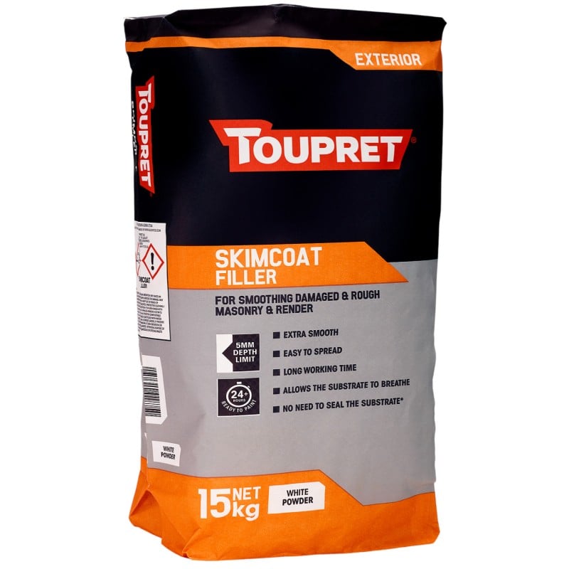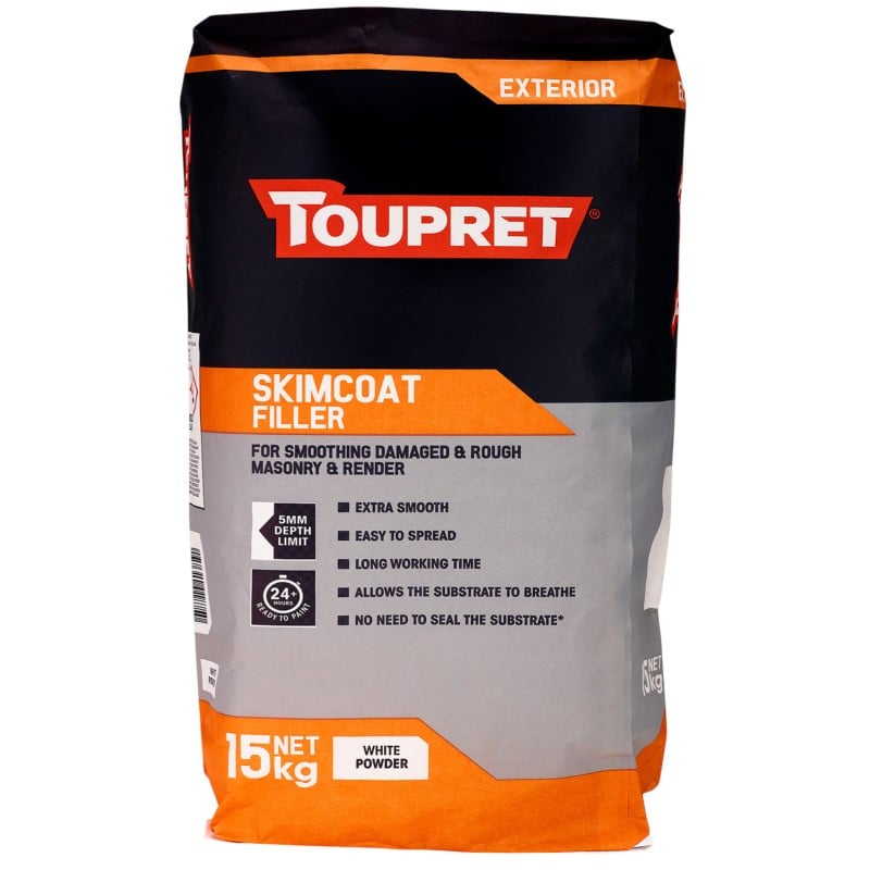 Toupret Exterior Skimcoat Filler is a cement-based powder filler for smoothing cracked, rough, and damaged masonry and render on exterior surfaces. Formulated for large surface areas, it produces an extra smooth finish that accepts paint within 24 to 48 hours.