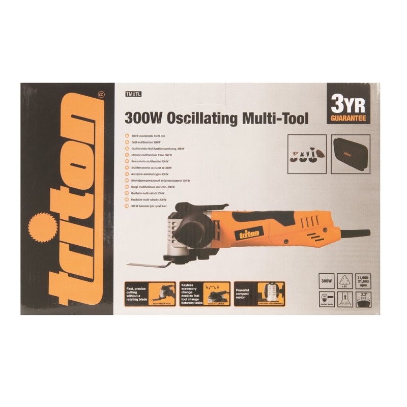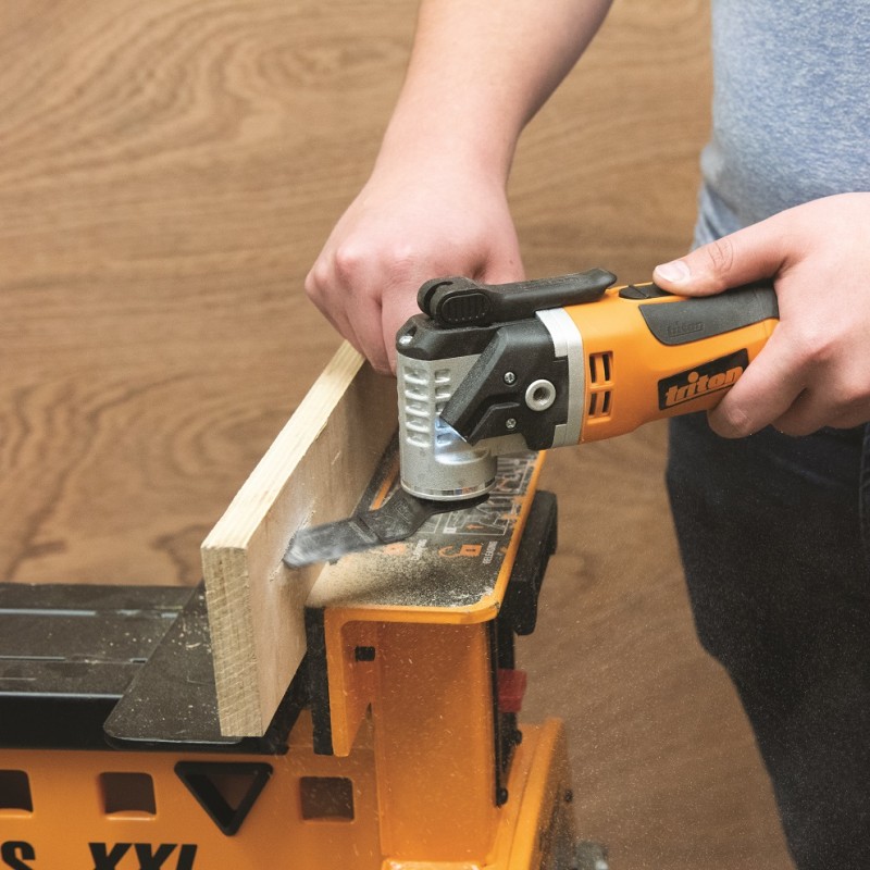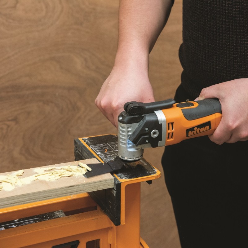 The Triton TMUTL Quick Change Oscillating Multi Tool is a powerful 300W multi-function machine designed to cut, sand, scrape, grind, rasp and polish with a single compact tool. Its oscillating action delivers high-performance sawing and trimming without a rotating blade, making it ideal for working close to edges, in corners and in tight spaces.