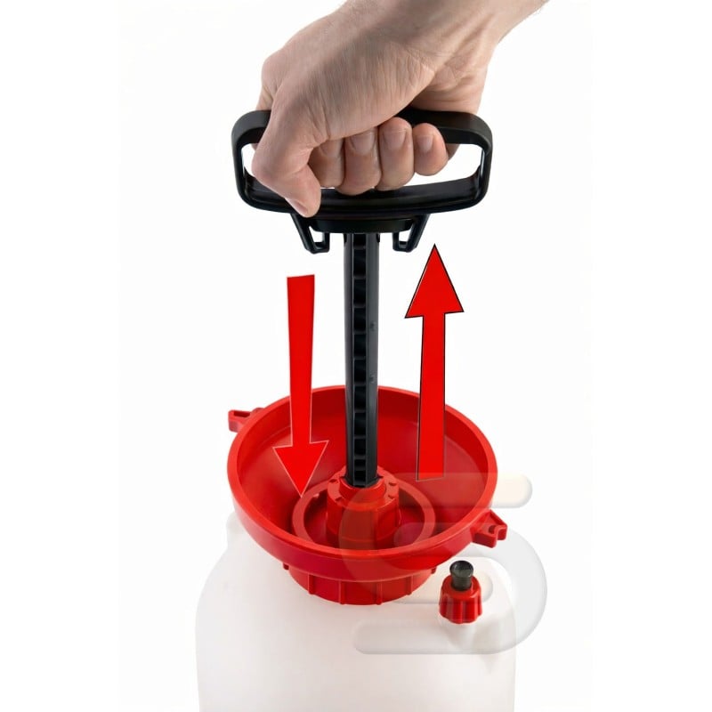 Pump the handle to build pressure inside the container
